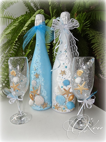 Жених и невеста могут быть одеты не слишком помпезно, а наоборот — просто и удобно. Никаких пышных юбок на кольцах и смокингов, лучше выбрать лёгкое платье свободного кроя для невесты и рубашку с брюками для жениха. Приветствуются аксессуары и украшения «морских» оттенков и соответствующей тематики, например так: