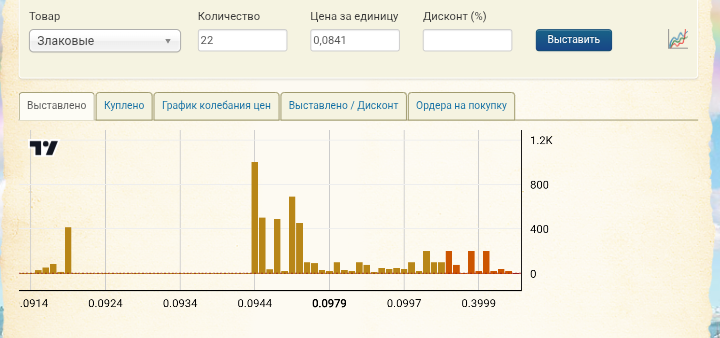 Да, и ещё один удобный инструмент мы упускаем из виду. Если мы не определились (из-за большого объёма лотов, которых не видно) ставить ли наш лот дешевле первой свечки или он там зависнет - можно поставить ордер на продажу. И когда (если) эти мелкие лоты улетят - спокойно продать свой товар по приемлемой цене и при этом не терять комиссии на перевыставление лотов.