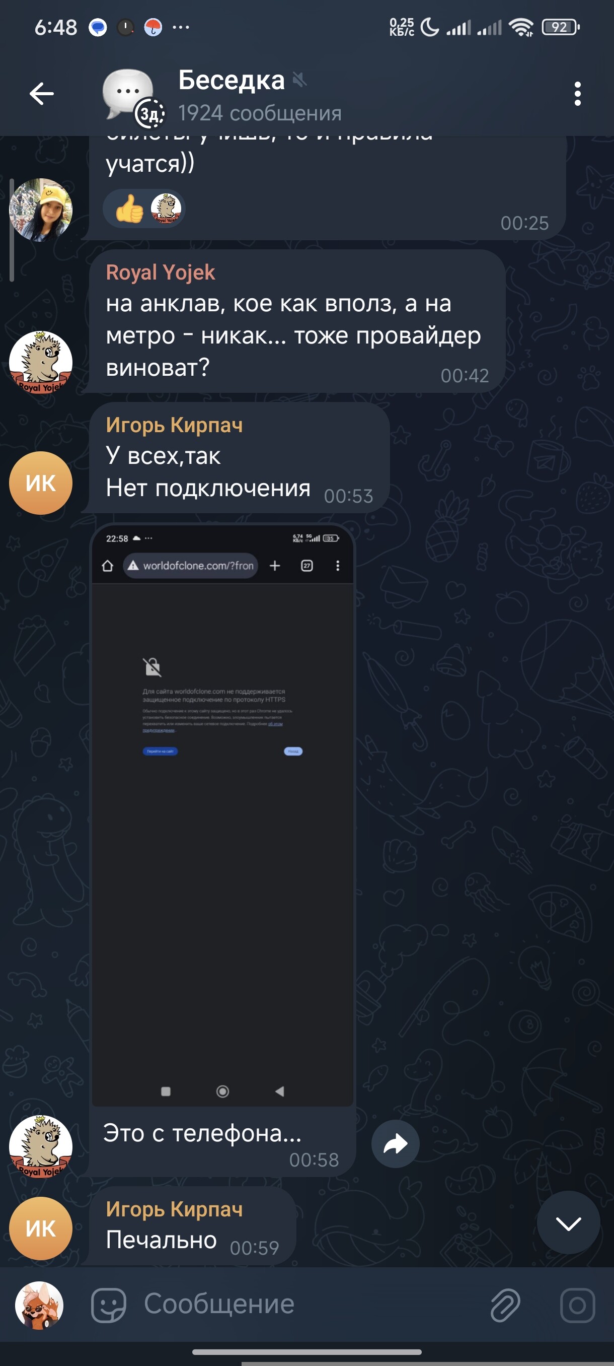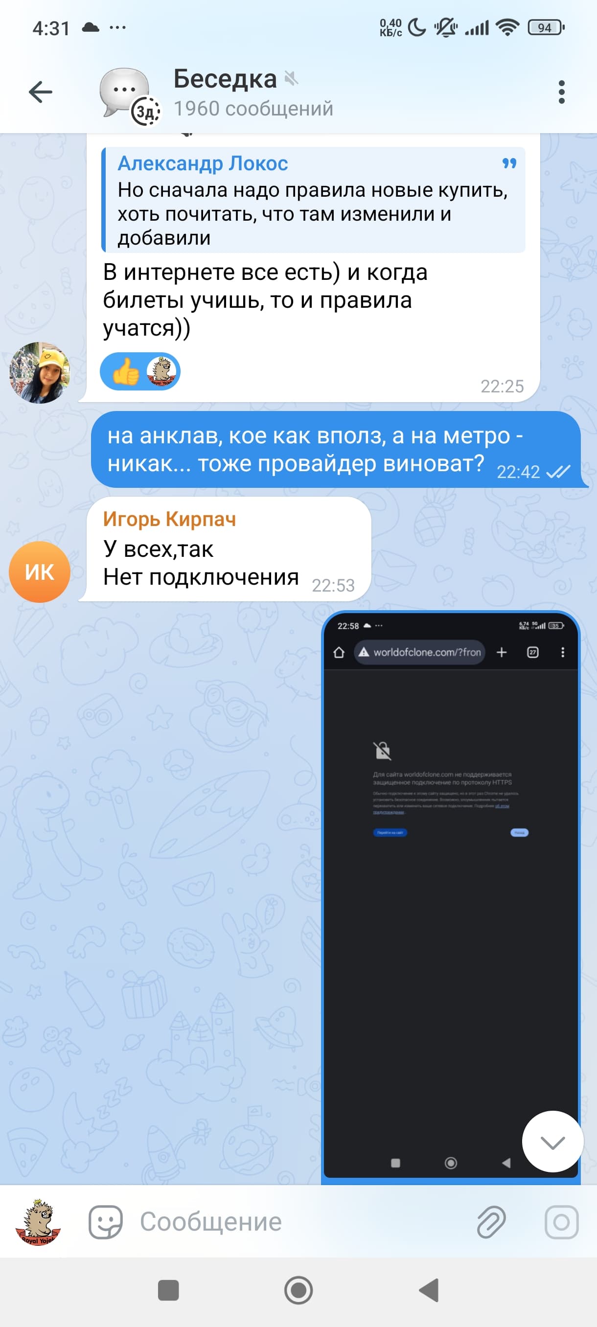 Держите себя в руках, юноша. И сравните свой скрин и мой. Они ИЗ РАЗНЫХ чатов, если вы не заметили… На моём скрине видно второе моё сообщение о то что на Анклав заходит (вернее - на тот момент заходило), а первое - со скрином о том что не заходит на Метрополию, по какой-то причине было удалено. Остался только ответ на это сообщение, от Игоря Кирпача, о том что у всех так.