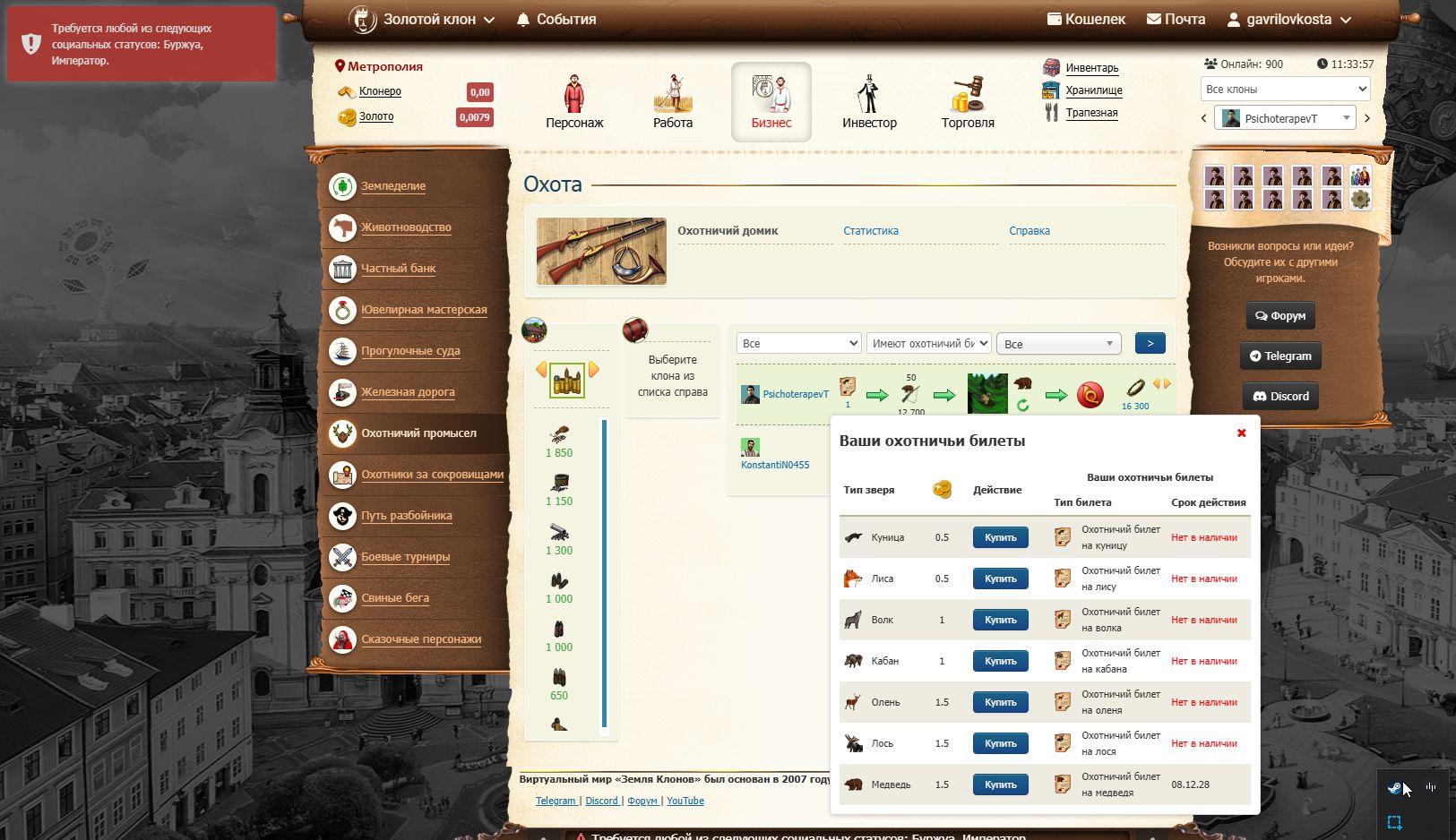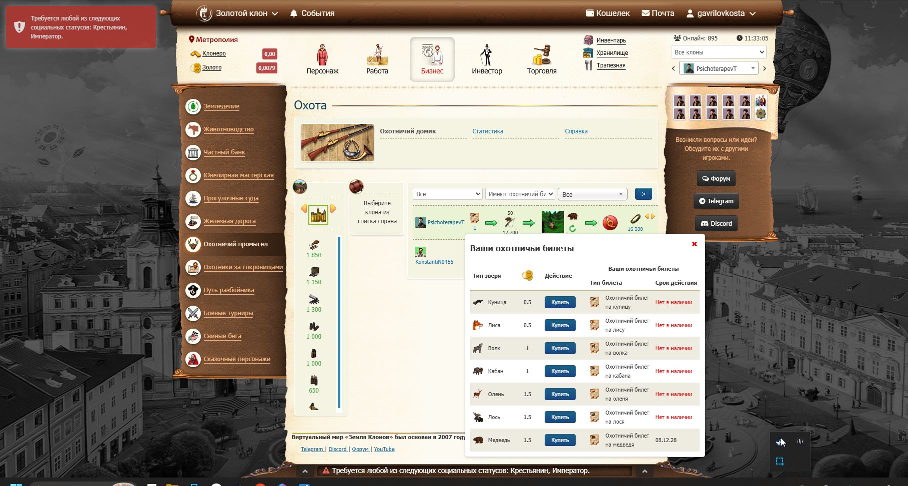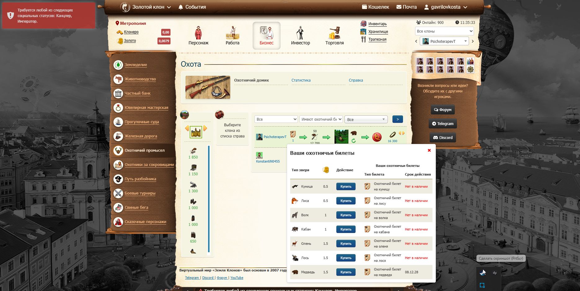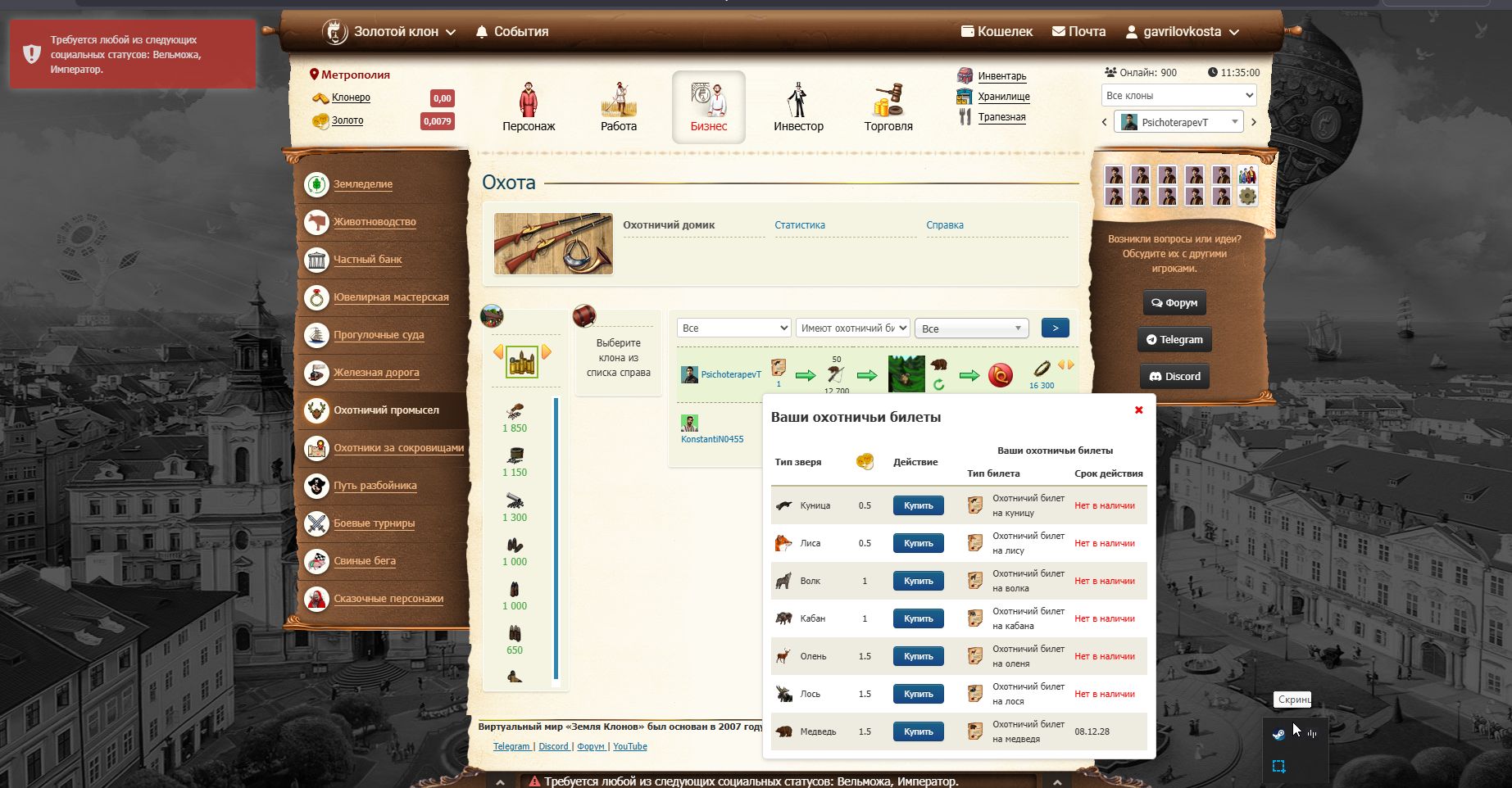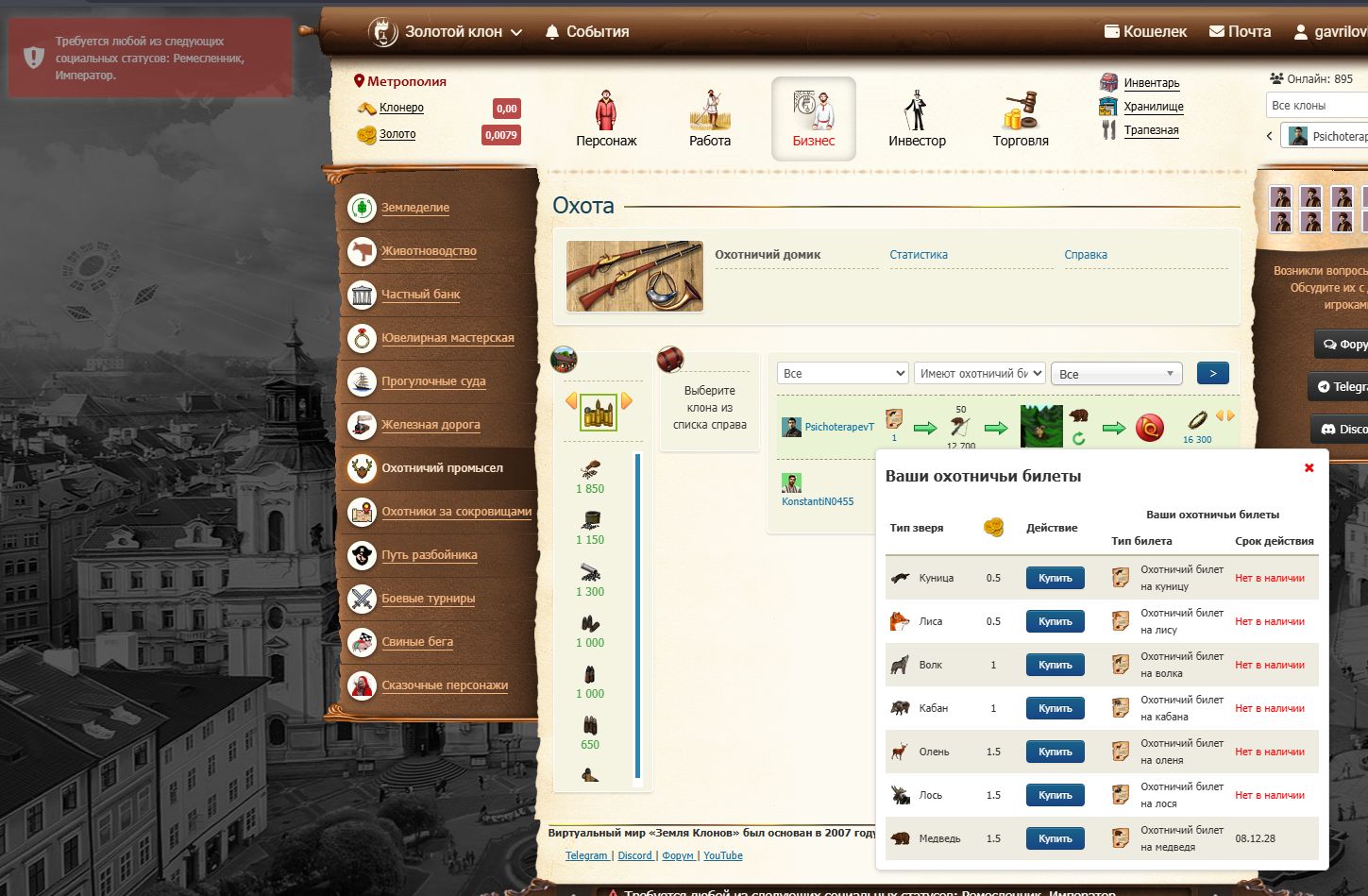 Верните возможность покупать лицензии клонам для охоты у меня есть граф но кроме как на медведя не могу ни на какого зверя купить лицензию, хотя лицензию можно купить на куницу например от статуса ремесленник, император, то есть имея статус графа я по идее и по правилам могу купить охотничий билет и пойти на охоту? только вот почему то не могу, либо правила измените либо почините блок охоты