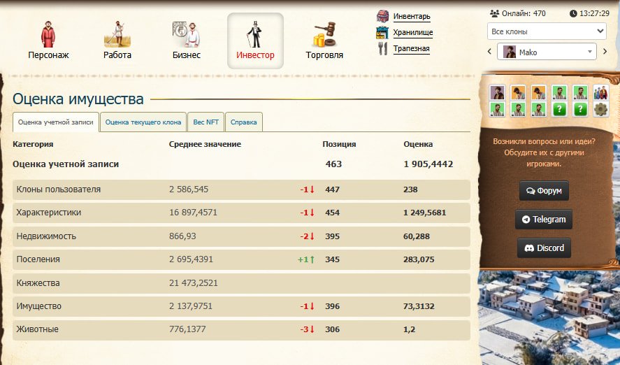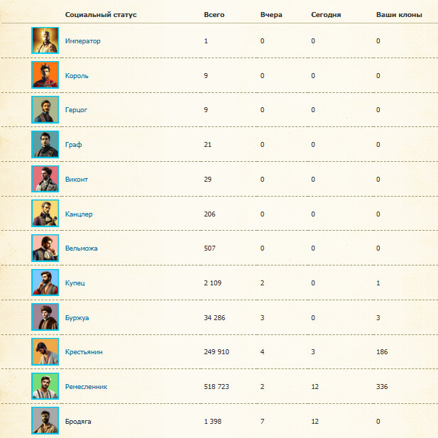 Всего 528 клонов, из них 1 купец - Князь, 3 буржуа, 187 крестов, 337 ремов. Все клоны отремонтированы. Почти все клоны добывают ресурсы в своих поместиях.